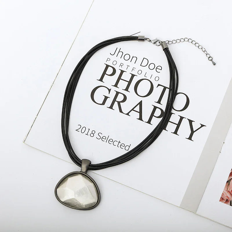 Pewter Tone Pendant Necklace Leather Cord Rhinestone - CIVIBUY