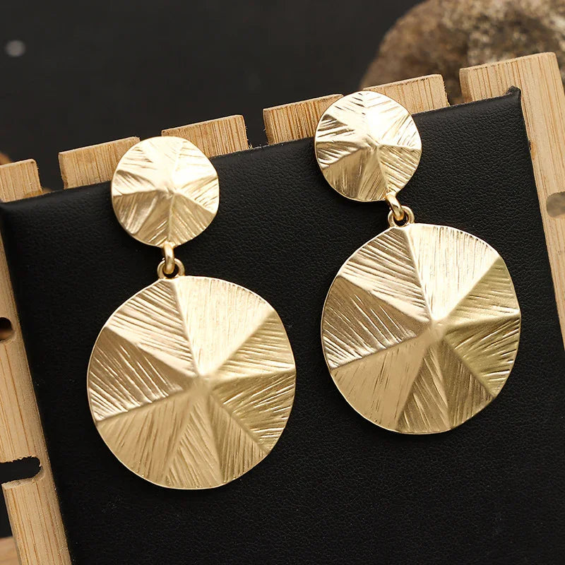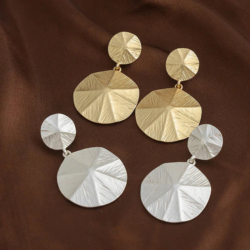 These Gold Tone Textured Disc Drop Earrings feature a subtle yet eye-catching fold pattern. Perfect for the modern woman, the lightweight design and timeless style of these dangle earrings bring a luxurious touch to any ensemble.