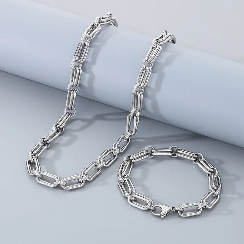 Make a bold statement with the Double Oval O-Link Stainless Steel Necklace Set. Crafted for those who dare to stand out, this minimalist yet edgy design suits any style, effortlessly elevating your look. Its durable stainless steel construction ensures lasting shine and strength, perfect for everyday wear or special occasions. Unisex and versatile, this necklace set redefines modern cool with a sleek, contemporary twist.
